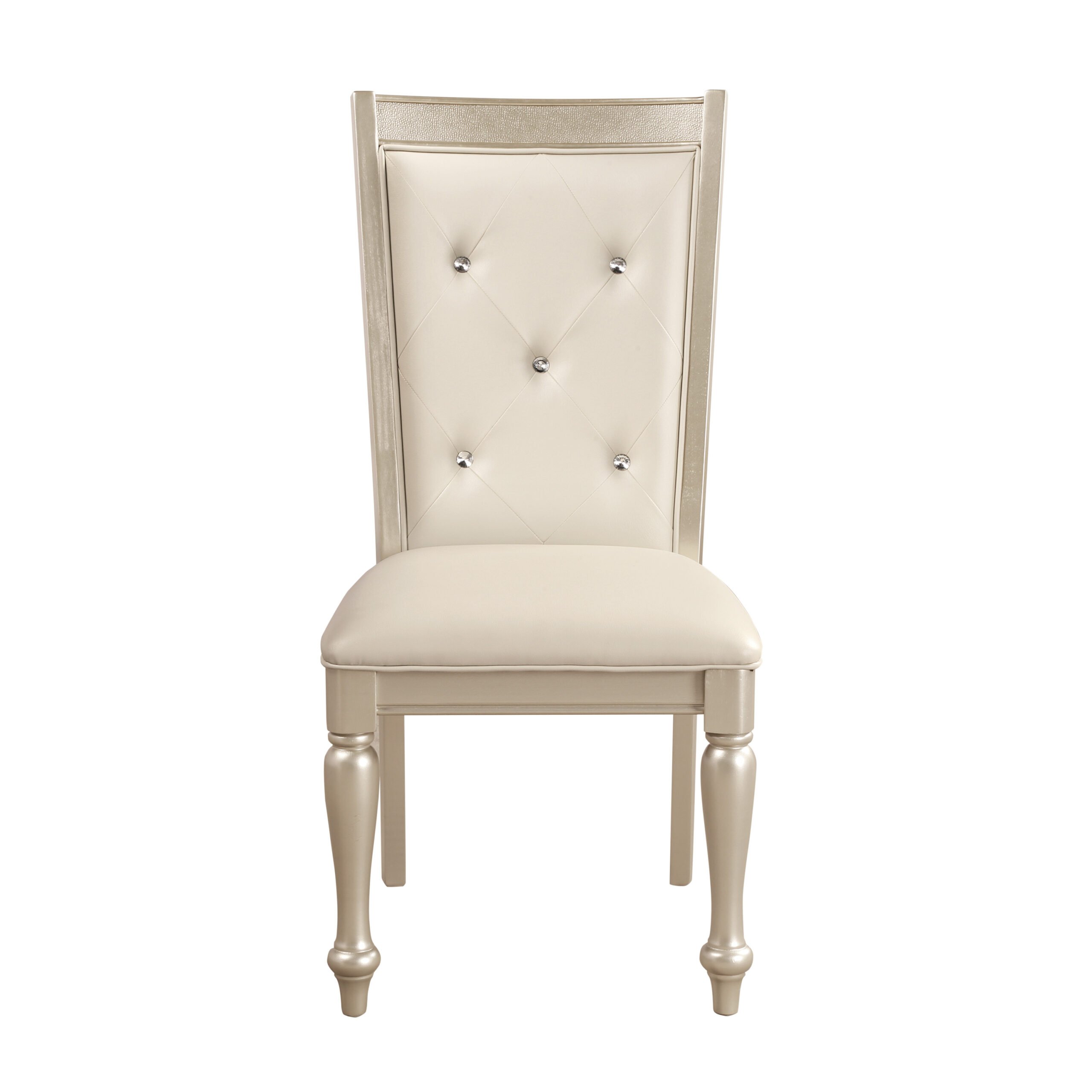 Designed and developed In: U.S.A, Solid wood frame chair, Finish Silver, Faux leatherupholstery, Crystal Button tufted chair back, Weight Capacity – 113.39 Kgs, Dining Table