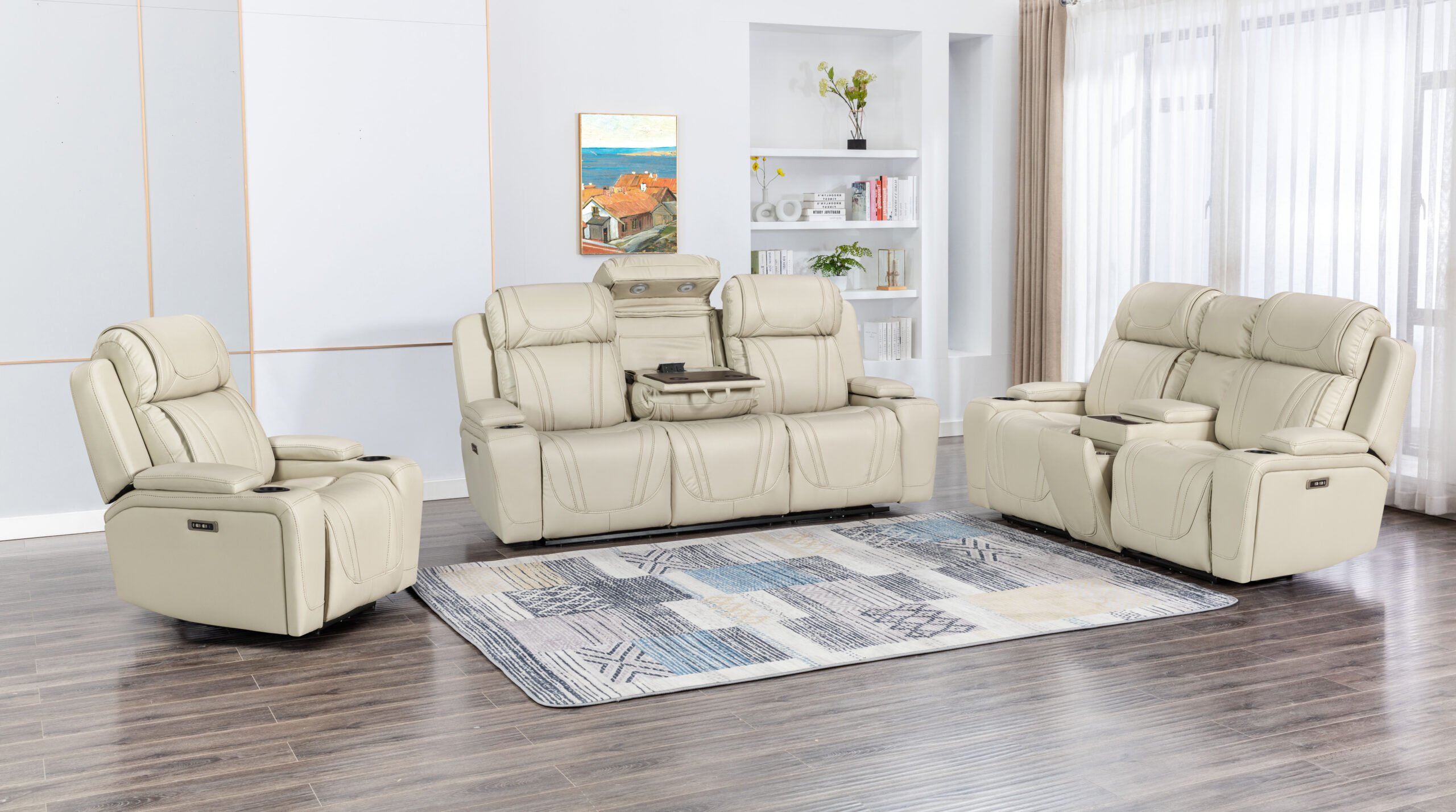 Redefine luxury lounging with the Mosswell 6 Seater Leather Recliner in Beige. This premium set integrates Bluetooth speakers, individual wireless charging, powered recliners, and adjustable reading lights—delivering a cutting-edge home entertainment experience wrapped in sumptuous leather comfort.