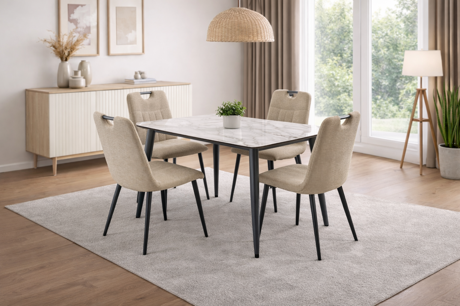 The Santorin Dining Set features a well-crafted dining table paired with four comfortable chairs, creating a welcoming space for everyday meals, casual dining, and meaningful conversations. Its elegant design and refined finish allow it to blend seamlessly with a wide range of interior décor styles.
