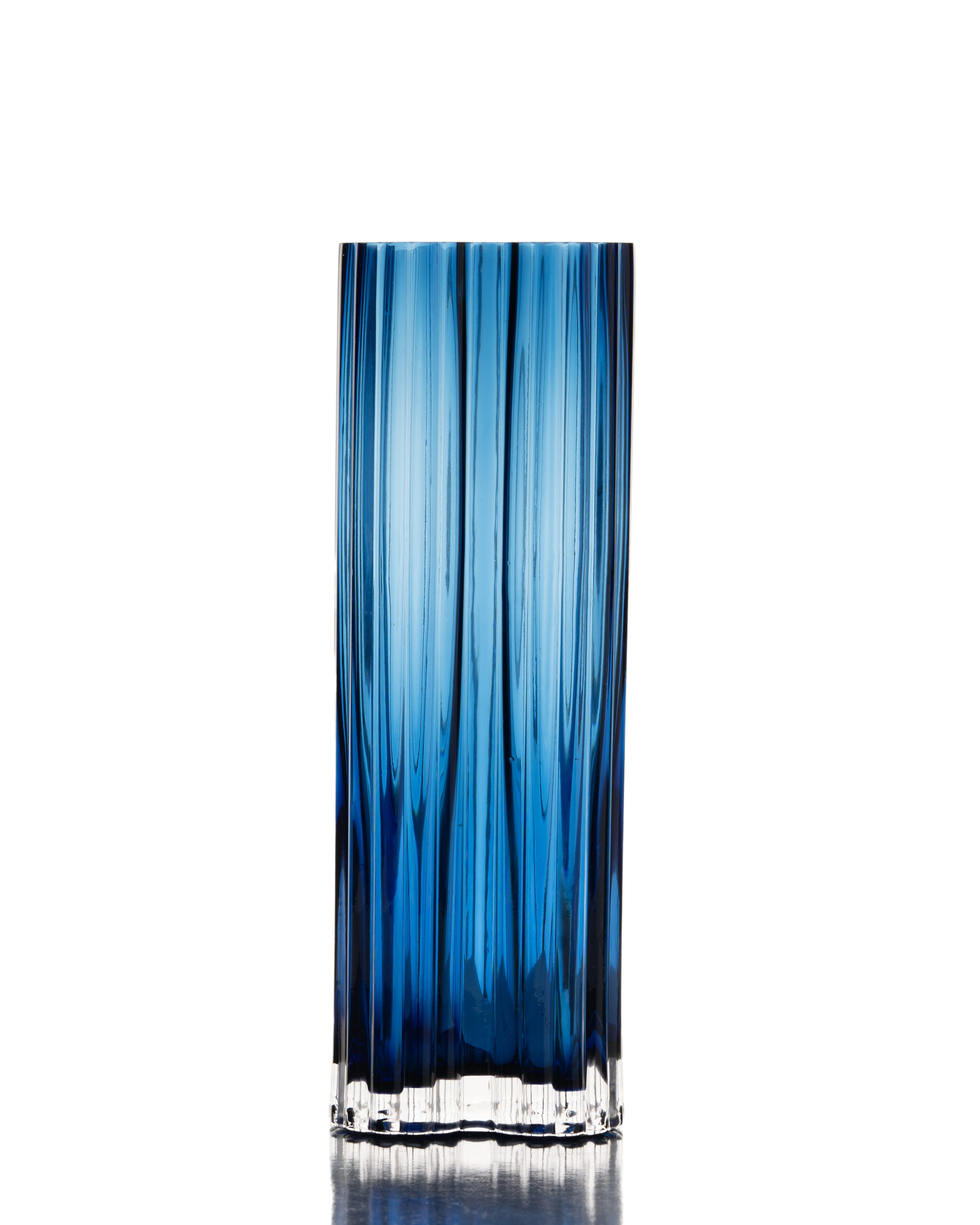 The SPHINX Glass Vase is a striking decorative piece featuring dramatic vertical ribbing in deep ocean blue. This tall, cylindrical vase combines contemporary design with classic craftsmanship, available exclusively at Victoria Homestore in Kenya.